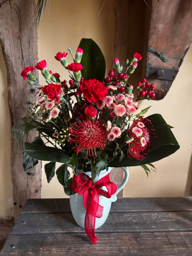 A lovely ceramic jug filled with Christmas foliage and flowers